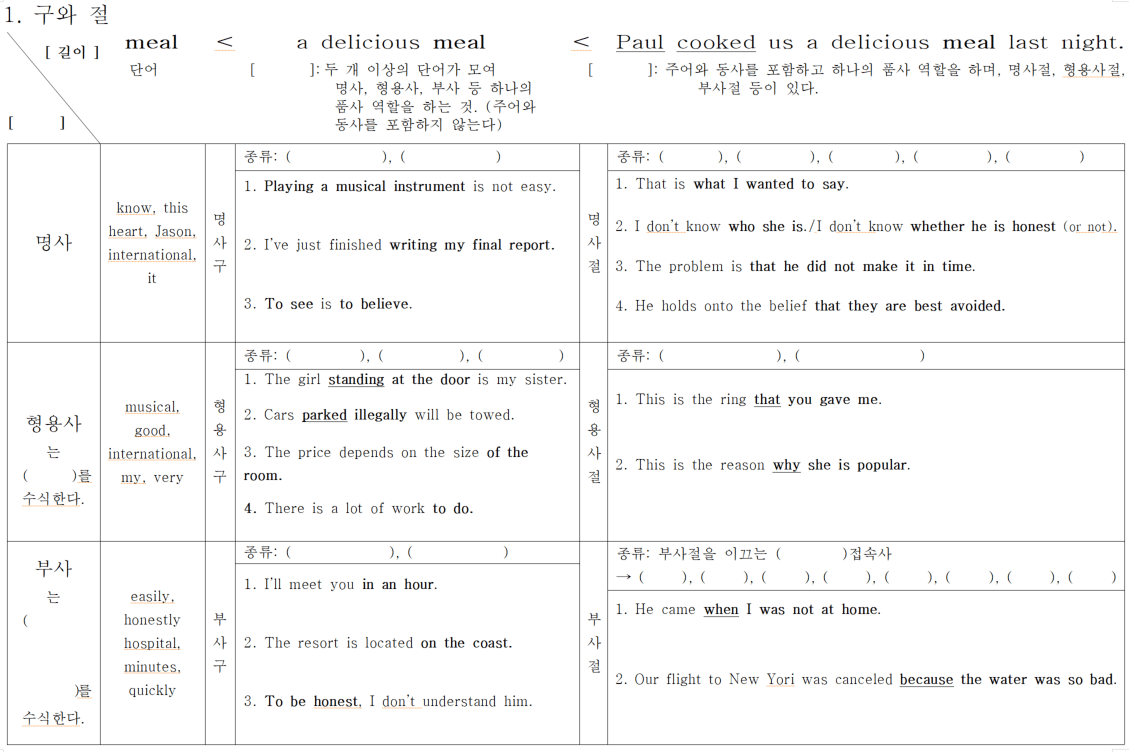 생각보다 구와 절의 정확한 정의가 무엇인지 알지 못하는 학생들이 많다. 모든 학문은 주로 쓰이게 될 단어의 정확한 정의로부터 시작된다. 이것이 선행 되어야 그 다음에 학습할 내용들을 탄탄하게 쌓아나갈 수 있다. 구와 절의 정의를 함께 살펴본 다음 이 둘의 차이점이 한눈에 보일 수 있도록 하는 장표를 만들었다. 구와 절은 먼저 첫번째 장표에서 배웠던 명사, 형용사, 부사의 품사를 기준으로 3개의 행으로 나누어서 정리했다. 그 다음 길이를 기준으로 단어->구->절 로서 길어지는 형태를 보여주기 위해 3개의 열로써 구성했다. 'meal'이라는 단어 하단에는 명사, 형용사, 부사에 해당하는 단어를 찾는 연습을 하기 위해서 단어 몇가지를 적어놓았으며, 중간 열에 속하는 구의 경우에는 명사구, 형용사구, 부사구의 예문을 읽어본 다음 굵게 표시된 부분에 집중하여 빈 칸에 알맞은 종류의 이름을 쓰도록 했다. 마지막으로 절의 경우도 마찬가지로 명사절, 형용사절, 부사절의 세가지로 구성했으며 예문을 보면서 굵게 표시된 부분을 분석하며 각 품사에 해당하는 절의 이름을 적도록 했다.